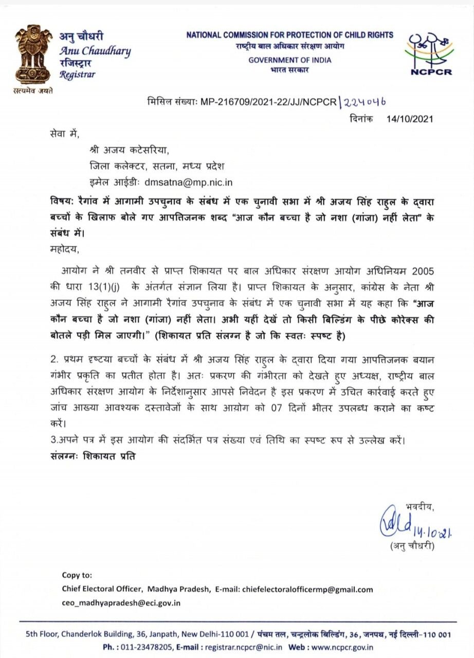 आयोग ने सतना कलेक्टर से अजय सिंह राहुल के खिलाफ कार्यवाही कर एक सप्ताह में प्रतिवेदन भेजने को कहा है।