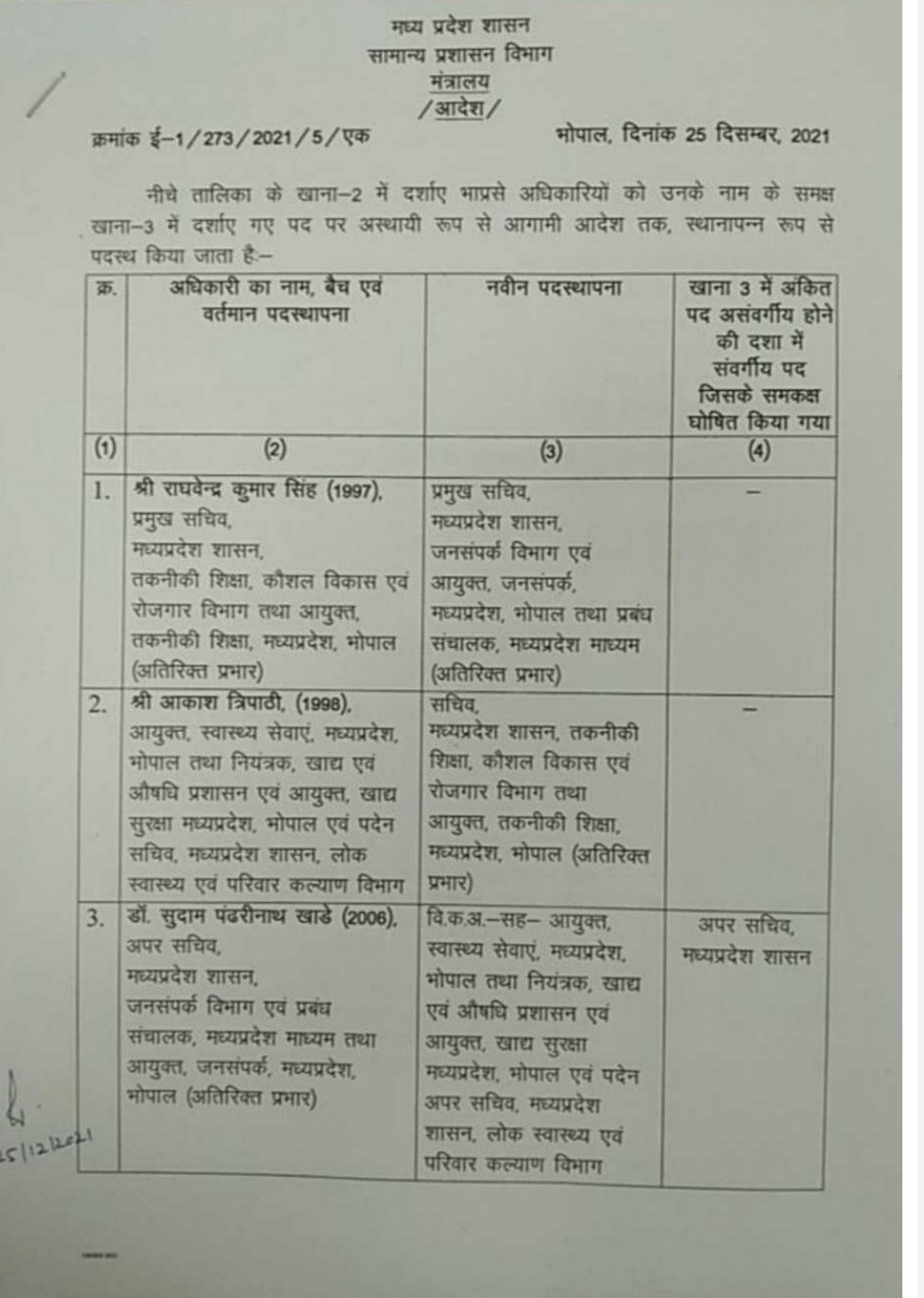 राघवेंद्र कुमार सिंह आईएएस (1997) बैच को प्रमुख सचिव एवं आयुक्त जनसंपर्क बनाया गया।
