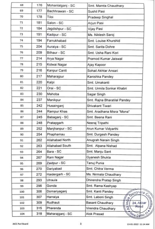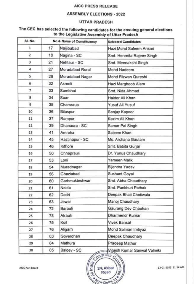 उत्तरप्रदेश विधानसभा चुनाव 2022..दल बदल की राजनीति के बीच कांग्रेस ने जारी की 125 उम्मीदवारों की पहली सूची जिनमे 50 महिलाओं को भी टिकट….