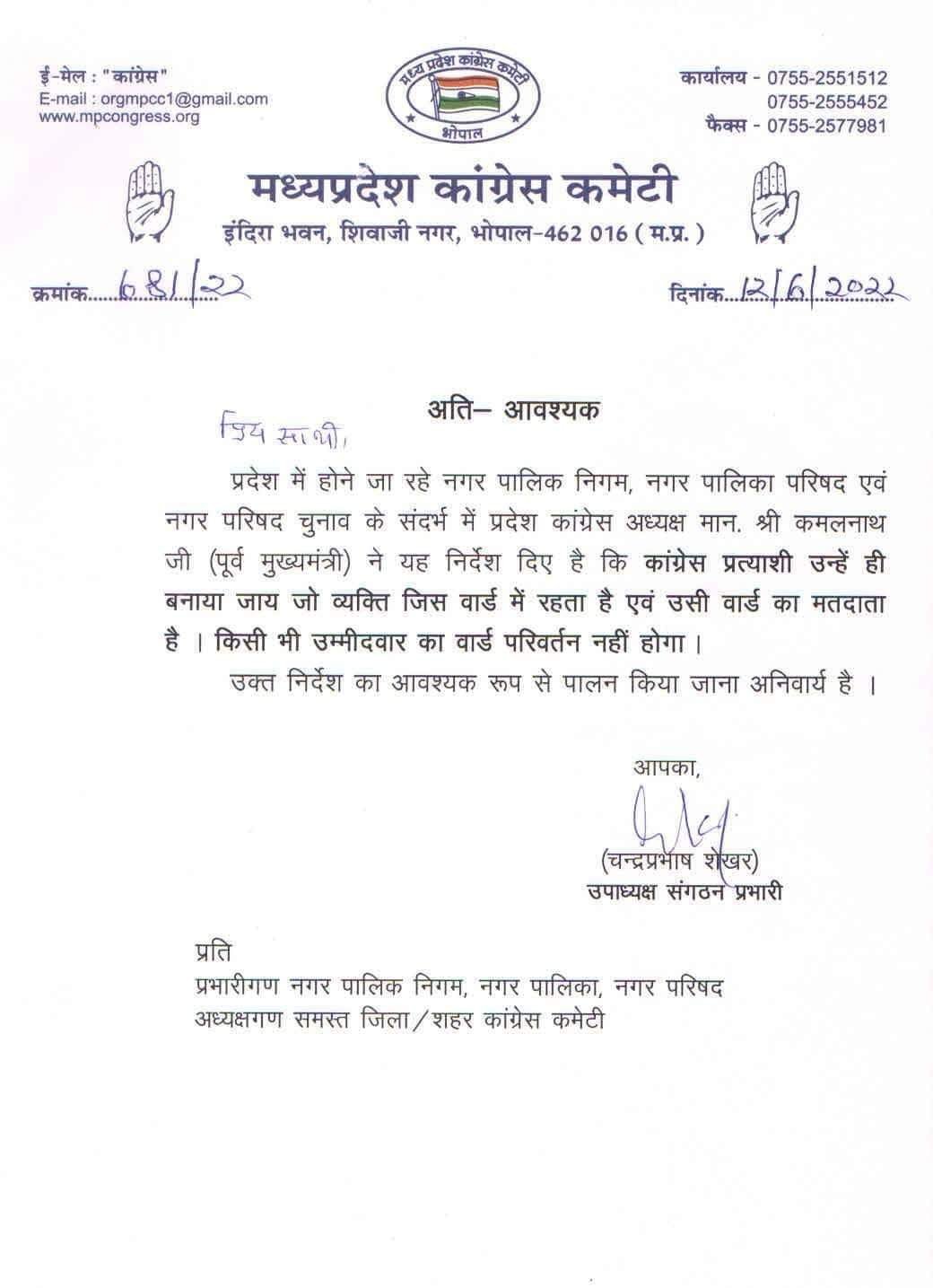 दरअसल इस पत्र में पीसीसी अध्यक्ष कमलनाथ ने स्पष्ट कर दिया है की नगरीय निकायों में टिकट के दावेदार केवल खुद जिस वार्ड में रजिस्टर हैं वहीं से दावेदारी कर पाएंगे।