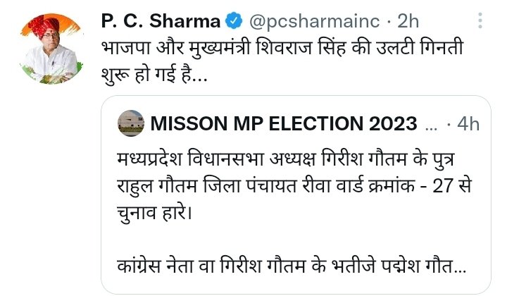 कांग्रेस ने इस मामले पर तंज भी कसा है। कांग्रेस विधायक पीसी शर्मा ने ट्वीट कर लिखा कि बीजेपी और सीएम शिवराज की उल्टी गिनती शुरू हो गई है।